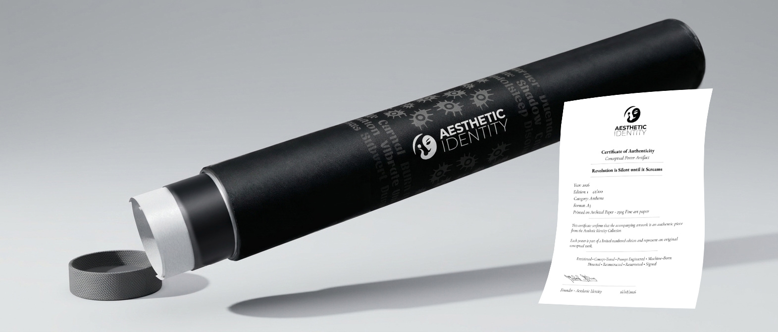 Your poster arrives carefully rolled inside a protective archival tube, ensuring the artwork reaches you in perfect condition. Included with every piece is a numbered Certificate of Authenticity, documenting its edition, origin, and status as an original conceptual artifact from the Aesthetic Identity collection.
